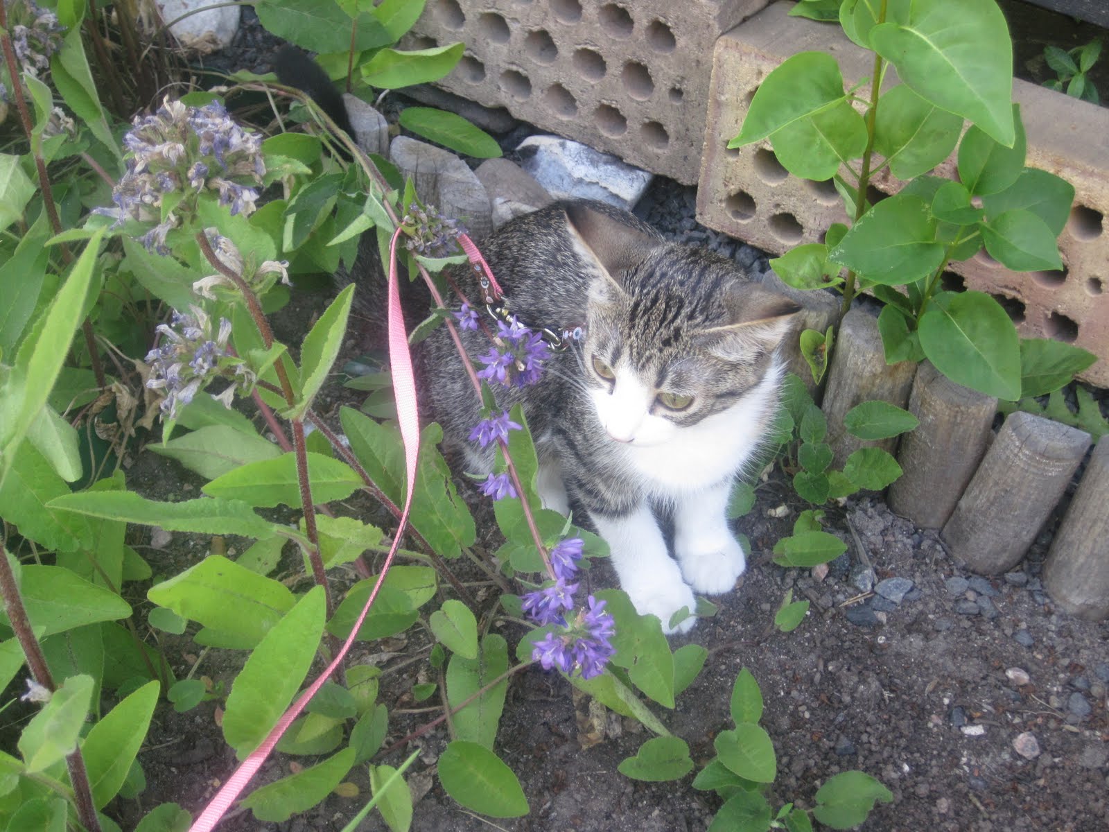 Tosin oli hiukan jännä paikka hetken, kun kissat olivat omasta hihnastaan vielä narussa kiinni, joka oli puu penkissä kiinni. No Tessalla se naru irtosi Tessan hihnasta, mutta onneksi, kun sen huomasin, löytyi Tessa heti kuusen alta ihan vierestä. Ehkä hyvä vaan, että meidän arkajalka oli se joka pääsi irti, eikä seikkailija.